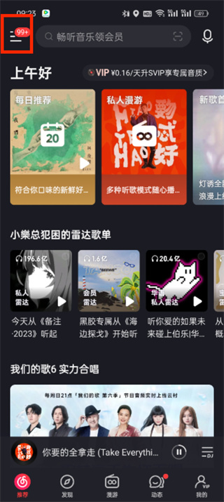 1、首先,启动网易云音乐应用,进入首页后,你会看到各种推荐的歌单。接下来,只需轻轻点击位于页面左上角的【三横图标】,即可继续操作。