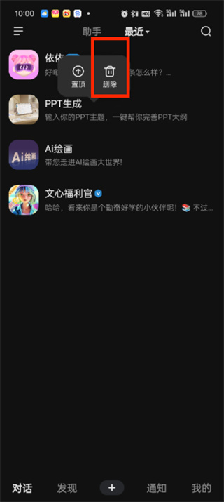 2. 点击进入【最近】页面后,长按您希望删除的对话记录,然后点击出现的【删除】按钮即可完成操作。