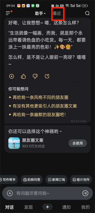 1. 首先,启动文心一言应用,进入首页后,您可以直接开始对话。接着,点击屏幕上方的【最近】选项;