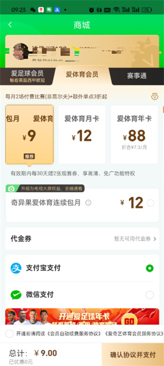 3. 最后,点击进入商城页面后,切换至爱体育会员选项,选择您需要的套餐,然后进行支付即可完成购买。