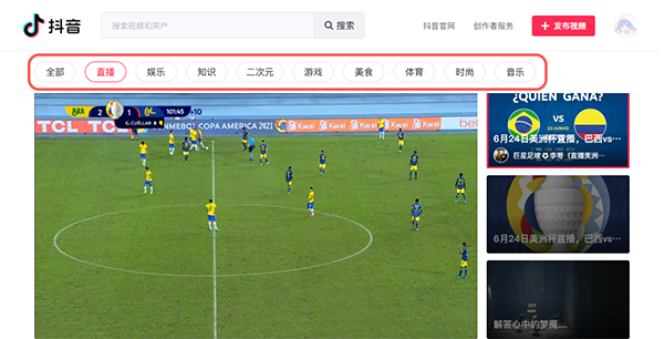 3. 在网页上方,你可以通过点击不同的标签来切换观看的短视频类型,例如直播、娱乐、知识、二次元、美食、游戏等,以便浏览你感兴趣的内容。