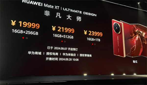 今日,华为正式发布了Mate XT非凡大师,起售价为19999元,并将于9月20日10:08准时开售。该机型提供瑞红与玄黑两种时尚配色,以及16GB 256GB、16GB 512GB、16GB 1TB三种存储配置供消费者选择。