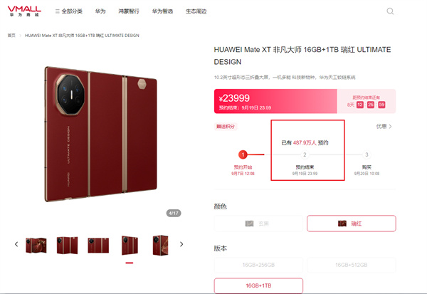 市场反响热烈,华为商城数据显示,Mate XT手机的预约量已突破487.9万人,接近500万大关。