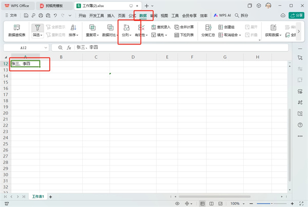 1. 打开WPS表格,定位并选择您希望拆分的单元格。接着,导航至“数据”选项卡,点击其中的“分列”按钮。