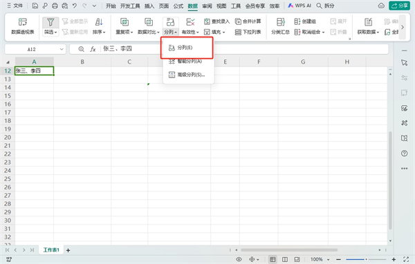 2. 点击该按钮旁边的下拉菜单,并从中选择“分列”选项。
