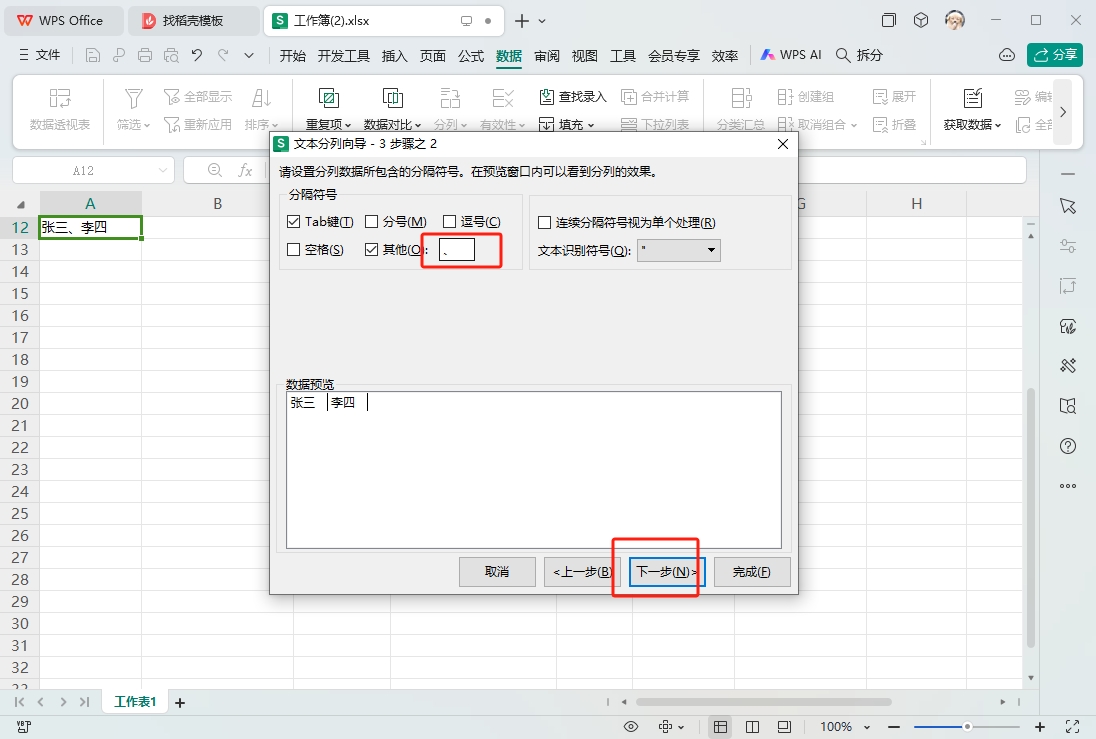3. 在弹出的对话框中点击“下一步”,然后根据内容选择合适的分隔符以进行分列操作。