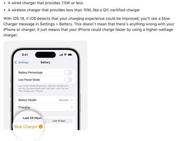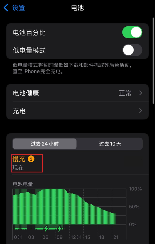 根据苹果官网信息,用户可以在“设置”-“电池”中查看电量图表。如果使用低于10W的无线充电器或7.5W的有线充电器,系统将推送提醒,并将图表颜色转为橙色,直观地提示当前处于慢速充电状态。