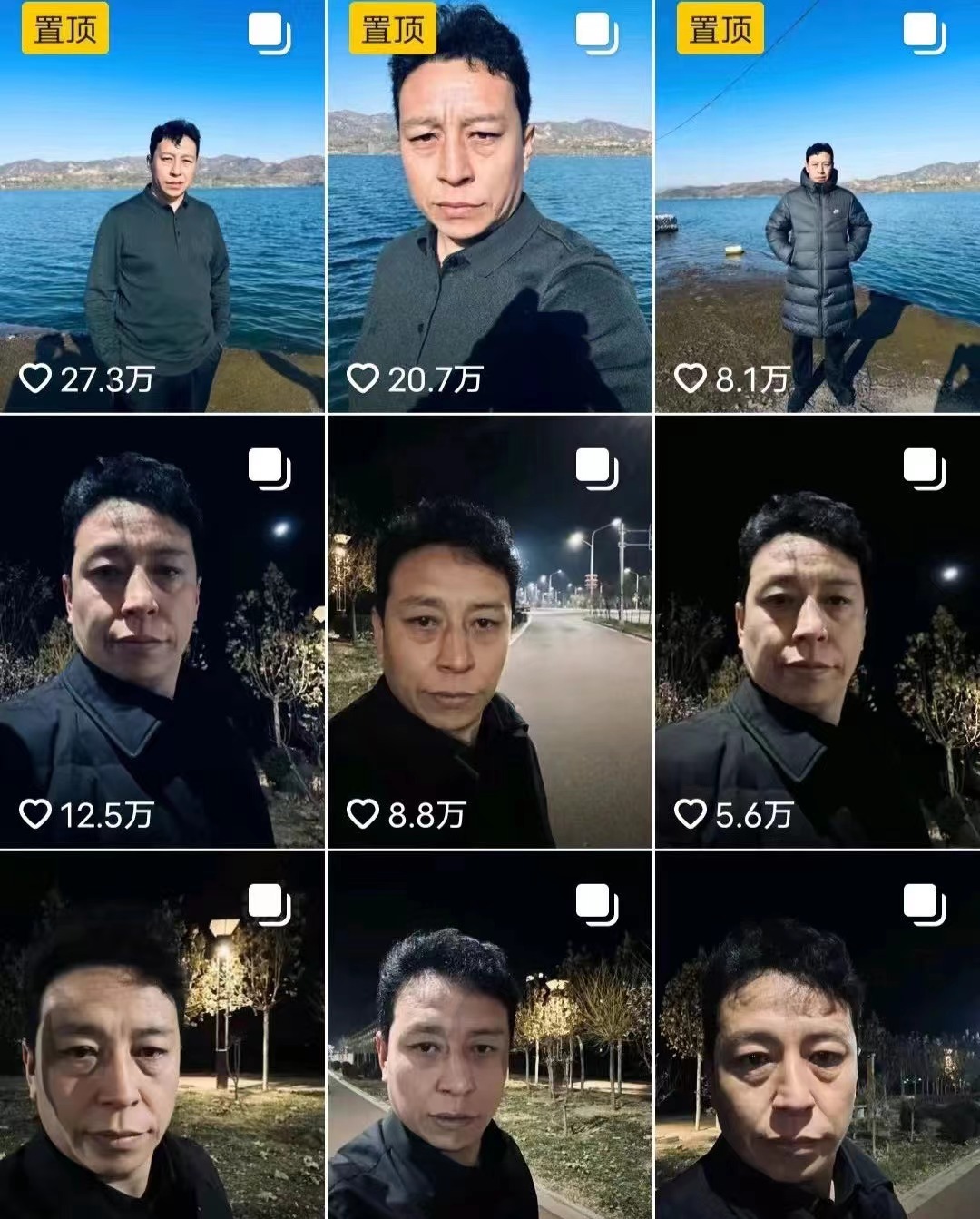 结果一往下拉,咦,全都是这个中年大叔的照片。我当时就想,又是哪个短视频平台又出了个网红呢?果不其然,我一搜抖音,发现这个叫闻会军的男人已经火了整整一夜。