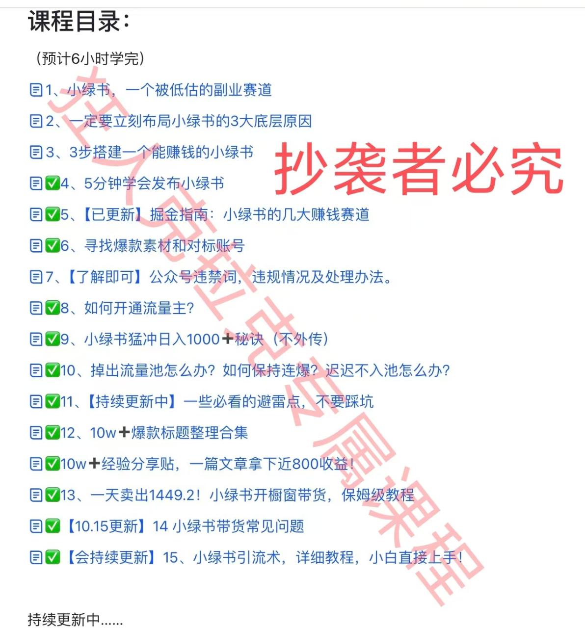 课程内容:小白起号、可以做的赛道、怎么进流量池、断流后怎么恢复流量、如何操作不违规、小绿书0粉开橱窗、如何选爆品、如何爆单日入1000➕、如何连爆💰收益翻倍……