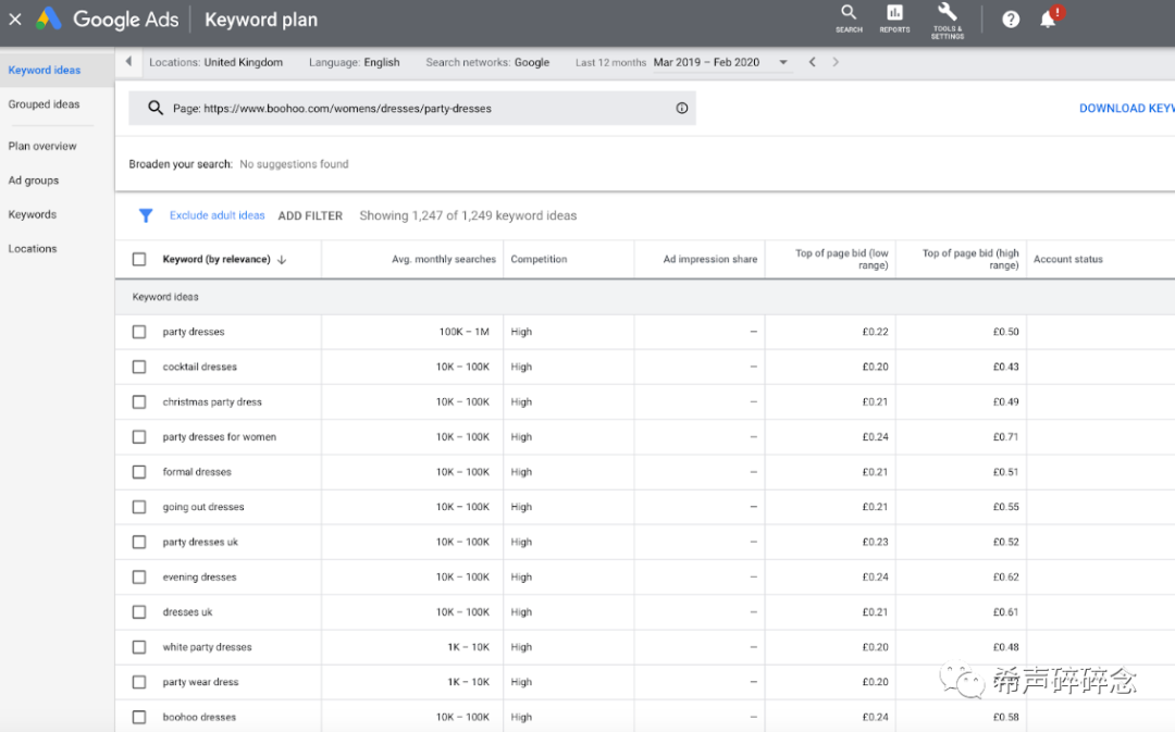 同样地,这又是一款谷歌官方出的免费工具,用这个工具的话需要先开通谷歌广告账号。谷歌广告账号可以自己用 gmail 账号注册或者找代理开通都可以,谷歌关键词大师最大的用处就是能够直接查询到关键词搜索量、竞争程度等关键数据,同时不论是做关键词调研,写文章找话题,都可以利用关键词大师找到大量的长尾词。比如下面这张表,能够直接看到关键词的搜索量,竞争程度,建议出价等。