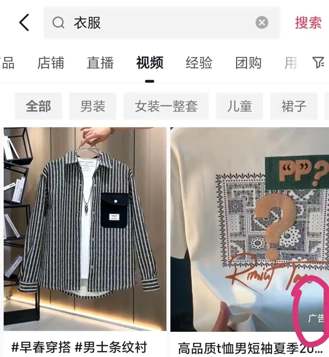 接着,打开抖音,随便搜个东西,比如衣服、包包之类的。在搜索结果的“视频”里,找到那些带“广告”标识的视频。