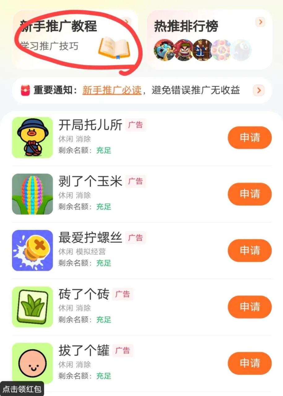 只要有人点进去试玩,不管是看广告还是充值,你都能拿收益!推广方式超多,平台里还有详细的新手教程,照着做就行,小白也能轻松上手。