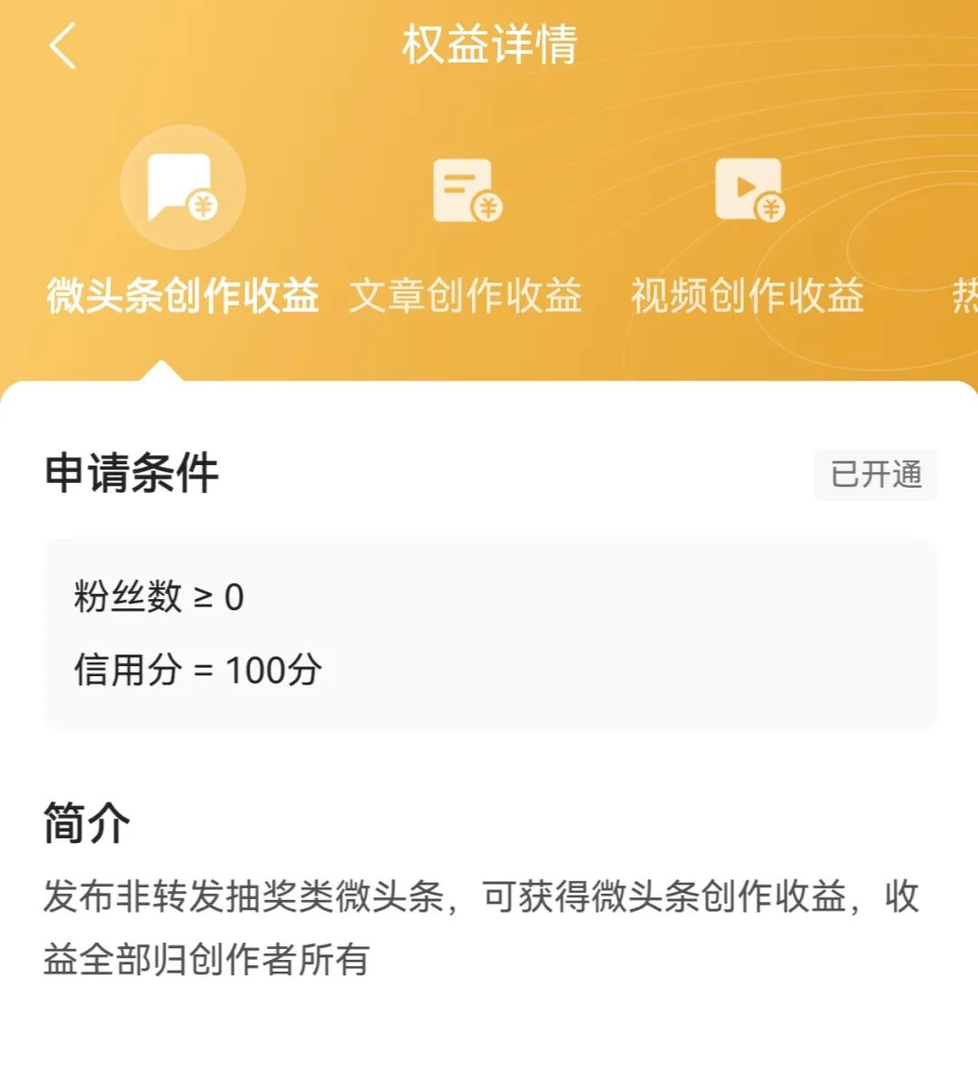 以前微头条需要100粉丝才能开通收益,现在0粉就可以,所以你只要写几百字的内容,配吸引人的图片,第二天就可以看到收益。(0.01也是突破)