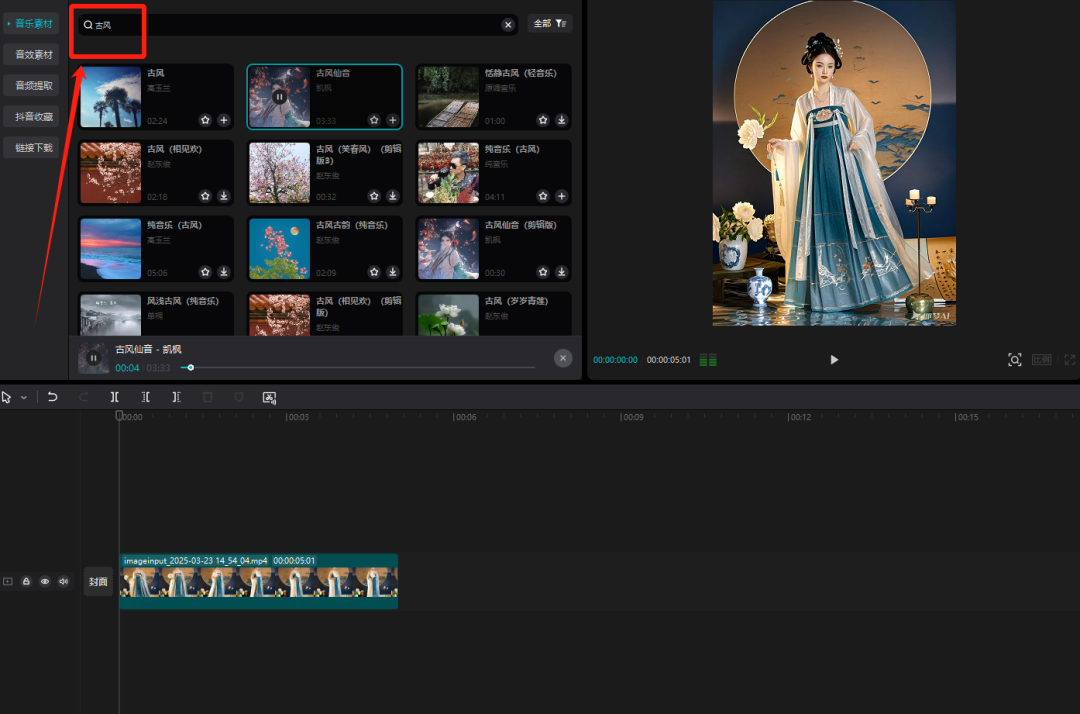 在音乐素材库,搜索古风,挑选一个自己喜欢的音乐即可。如下图所示。