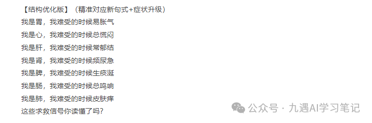 先找到对标账号的爆款视频,通过工具提取它的文案。以“身体的警告知多少”这条内容为选题,提取到的文案如下: 我是胃,我不舒服的时候容易多醒。我是心,我不舒服的时候容易多汗。我是肝,我不舒服的时候容易多梦。我是肾,我不舒服的时候容易多尿。我是脾,我不舒服的时候容易多痰。我是肠,我不舒服的时候容易得癖。我是肺,我不舒服的时候容易多痒。我们不舒服的情况你记住了吗? DS网址:https://chat.deepseek.com/ 得到文案我们去Deepseek进行改写,打开DS,开启深度思考和联网功能,输入这段提示词:改写下面这段爆款文案,要求文案结构调整为“我是X,我难受的时候容易XX”,每一句字数都要一致,器官难受的症状可以适当修改。原文如下:……