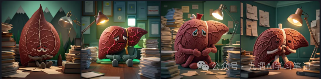 相同的办法,分别将所有文案对应的图片一一做出来,这里展示几组给大家看效果,对应的提示词也在上面。 图一:卡通胃器官粉红色肉感立体造型,圆鼓鼓的肚皮表面有胀气纹路,拟人化五官呈现皱眉苦脸表情,Q萌短手揉着腹部,半透明质感展现胃部结构,背景为摆满食物的厨房场景,暖色调光泽渲染