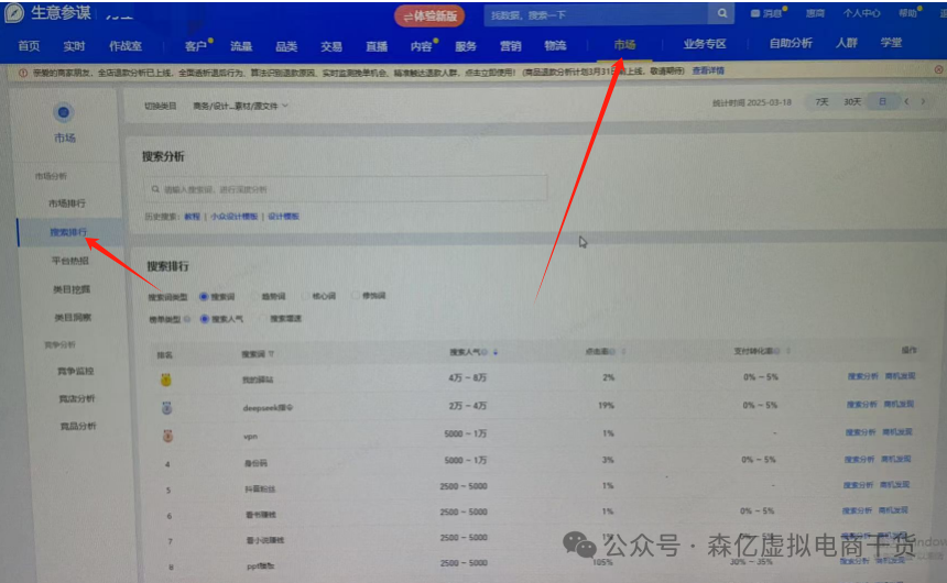 首先,我要打开店铺的生意参谋,点击“市场”,然后“搜索排行”