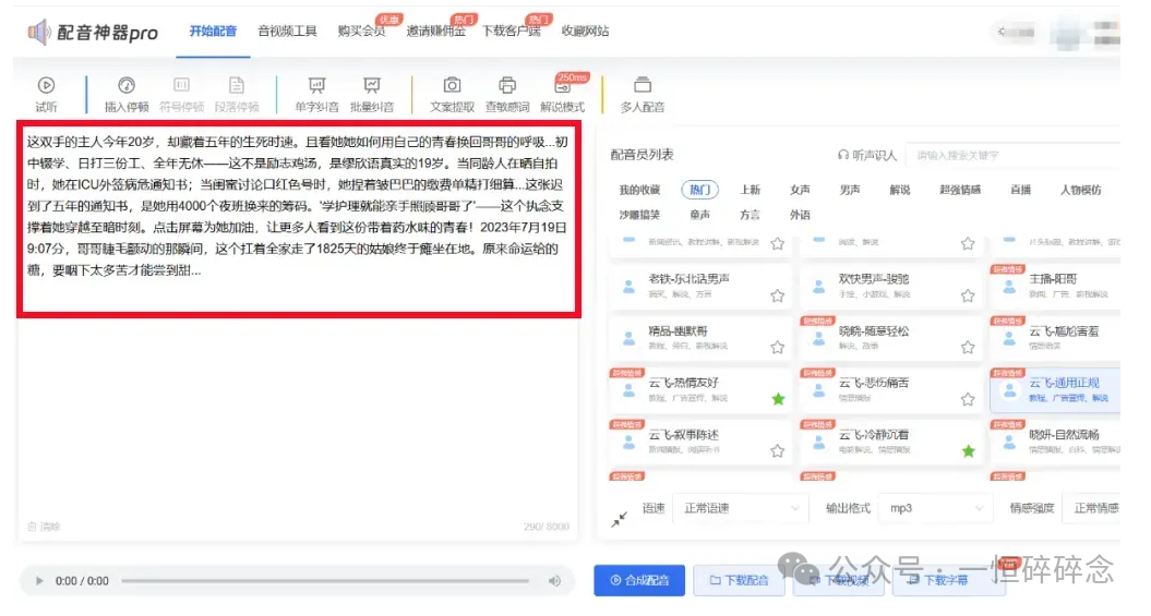 具体咋用呢?你把刚才改好的视频脚本,复制一下,粘贴到配音工具的文本框里。然后在右边挑选一个合适的声音来配音,好多人都喜欢用【云飞】这个声音,效果挺不错的,你也可以试试。