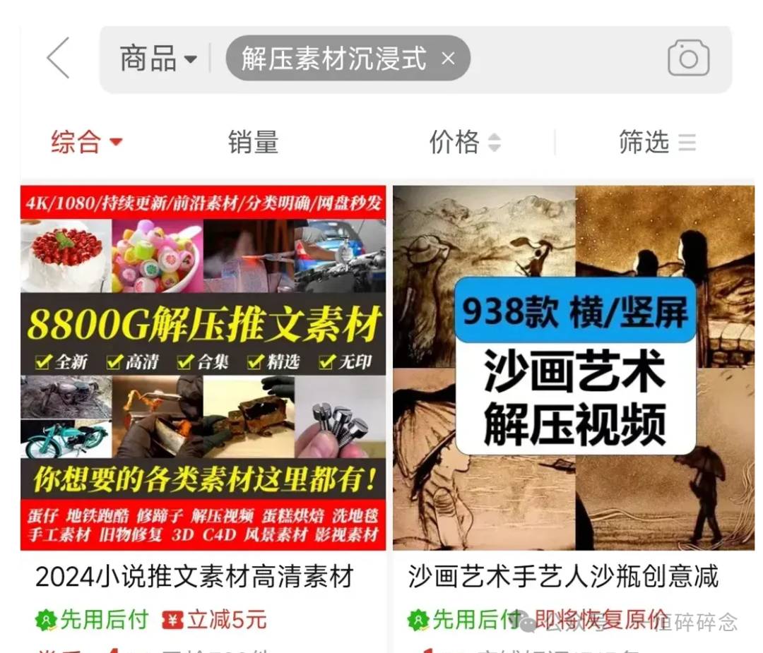 咱们不是要做解压形式的视频嘛,这就需要解压类的视频素材。你去拼多多上花几块钱,就能买到一大堆素材,刚开始做视频用这些完全够了。