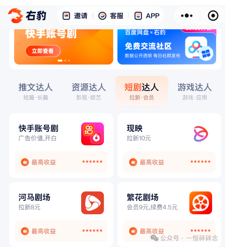 右豹这个平台,最大的优点就是特别好上手。不管你抖音号有没有实名认证,也不管你是 0 粉丝的新号,都能在上面搞推广。咱打开右豹的主页大厅,里面能看到各种各样等着推广的 APP。你瞅见哪个 APP 感兴趣,点进去看详情,马上就能申请推广它的任务,简单得很!