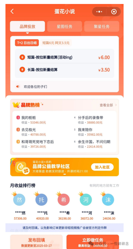 等你决定好要推广哪个小说APP了,就得挑具体要推的书。拿蛋花小说来说,你点进它的详情页面,很容易就能看到一个特别显眼的“申请做任务”按钮,看到这个按钮,直接点它,后面的流程就自动开启了,超简单的。