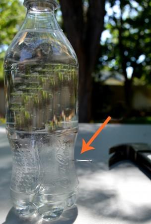 2、然后在瓶子的底部轻轻戳一个小孔。接着请孩子们吹气球,观察有什么不同?在吹气球的同时,将手指轻轻放在瓶子的洞口,是否感受到了空气的流动?