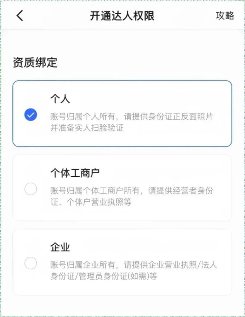 一般都是个人的或者个体工商户,个人的就只需要sfz,个体工商就需要营业执照,按需选择。