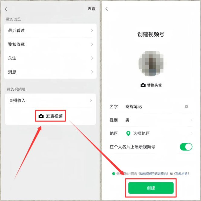 视频号的入口就在微信的“发现”页面,点开后点击右上角的“人头像”,再点“发表视频”,就可以创建你的视频号了,就像下面这张图展示的。