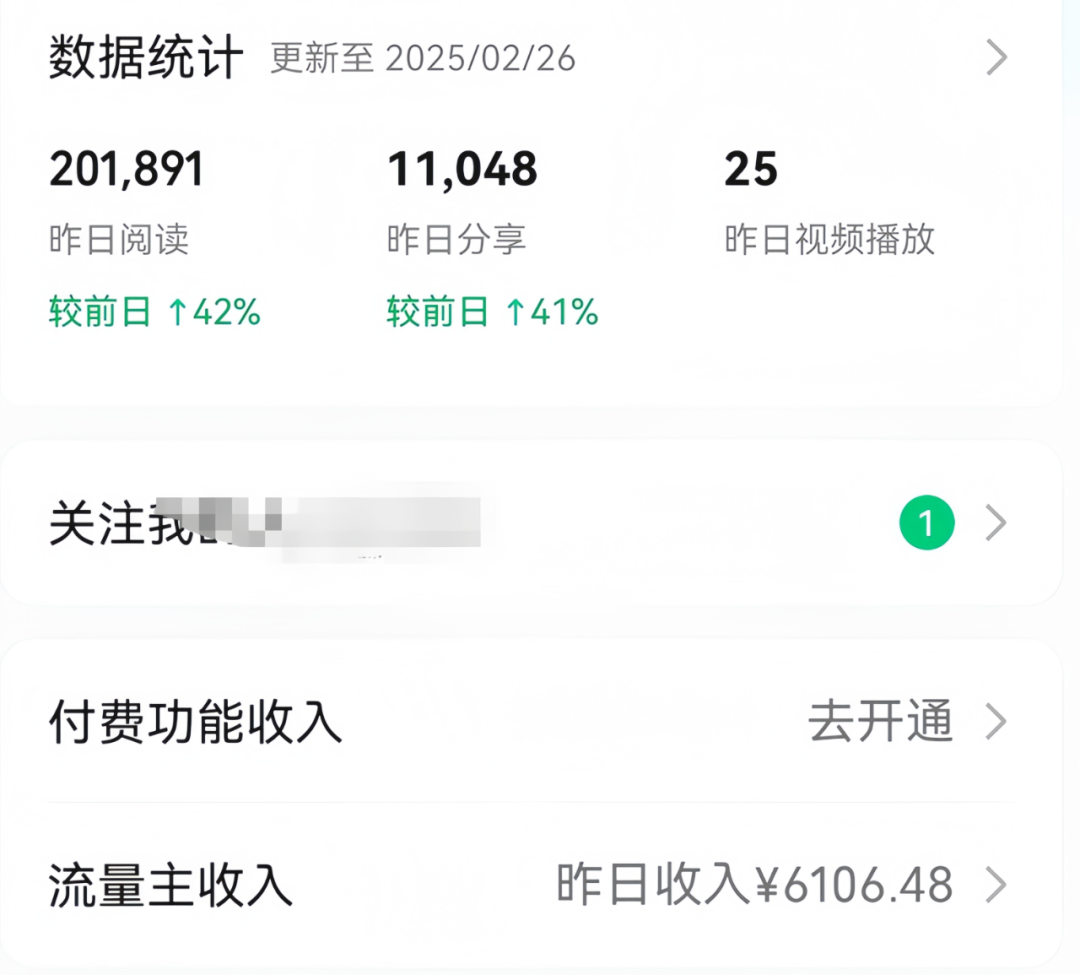 等你的粉丝数涨到500个以后,就能开通流量主功能了。这样一来,只要有人看你的文章,后台就会有收益进账。