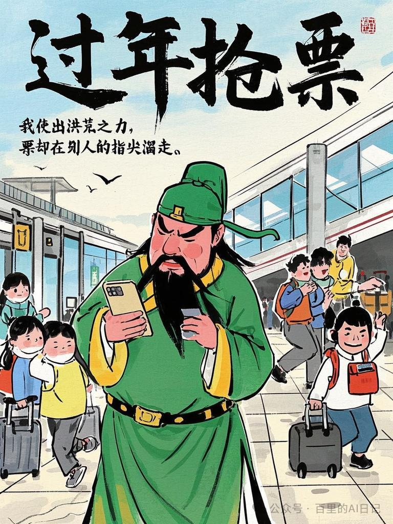 水墨风格插画,三国人物关羽,身着传统绿袍、头戴绿头巾,关羽站在高铁站广场,手里拿着手机,愁眉苦脸,周围有一群人提着行李箱,满面笑容,画面上方有大字配文:“过年抢票“,小字配文”我使出洪荒之力,票却在别人的指尖溜走。”