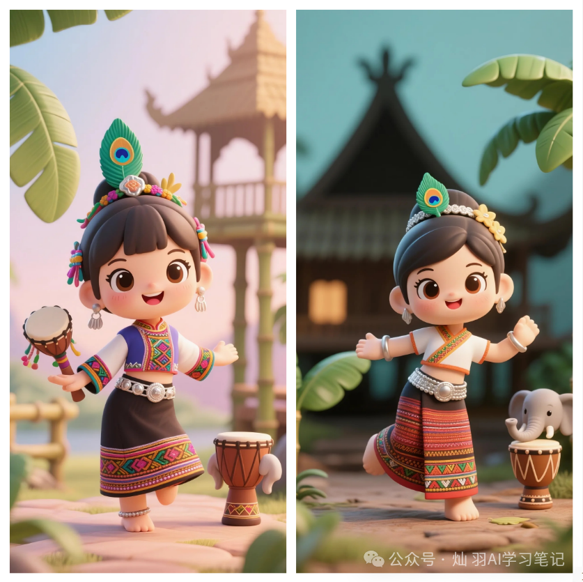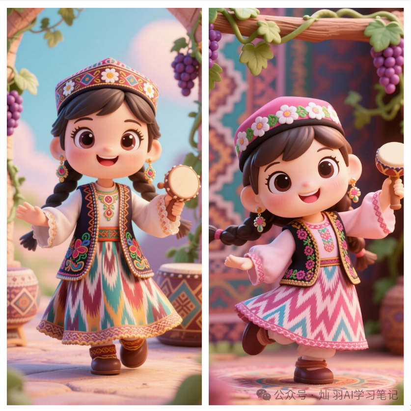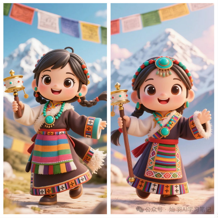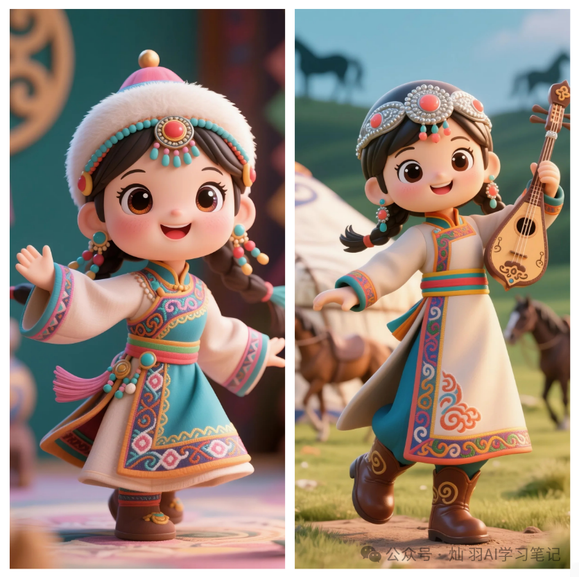 基础模板 示例组合组合成完整的绘画提示词:以蒙古族为例,组合成的提示词为:[蒙古族]少女手办,Q版三头身比例,圆润大眼睛,可爱包子脸,[羊皮长袍配彩色镶边,云纹刺绣腰带,红珊瑚头饰],手持[马头琴],站在[背景蒙古包与草原,毛绒绒的羊羔伴身边]前,柔光渲染,3D渲染风格,Pixar动画质感,C4D建模,oc渲染器,8k高清细节