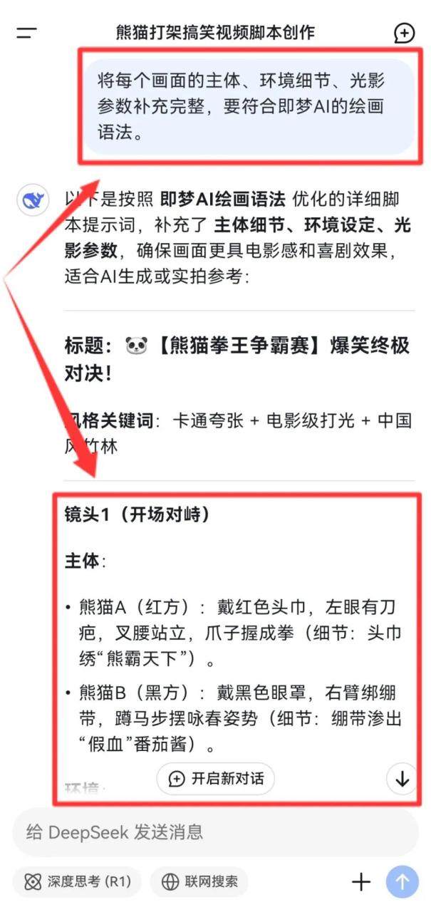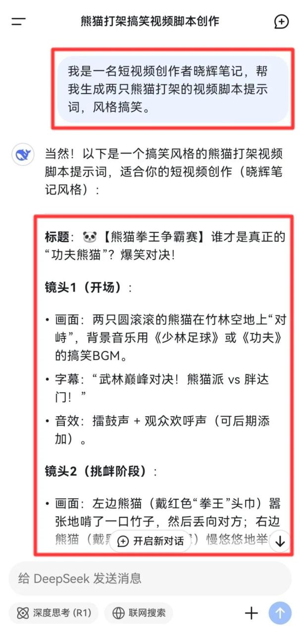 (AI会输出类似内容:熊猫A偷袭→熊猫B反击→最后卖萌和好)