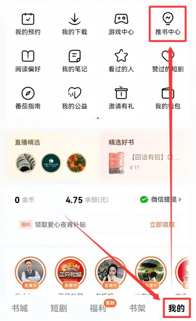 登录之后,点右下角那个【我的】,再找到【推书中心】,在创作任务里就能看到【种草好书搞马内】的活动入口。