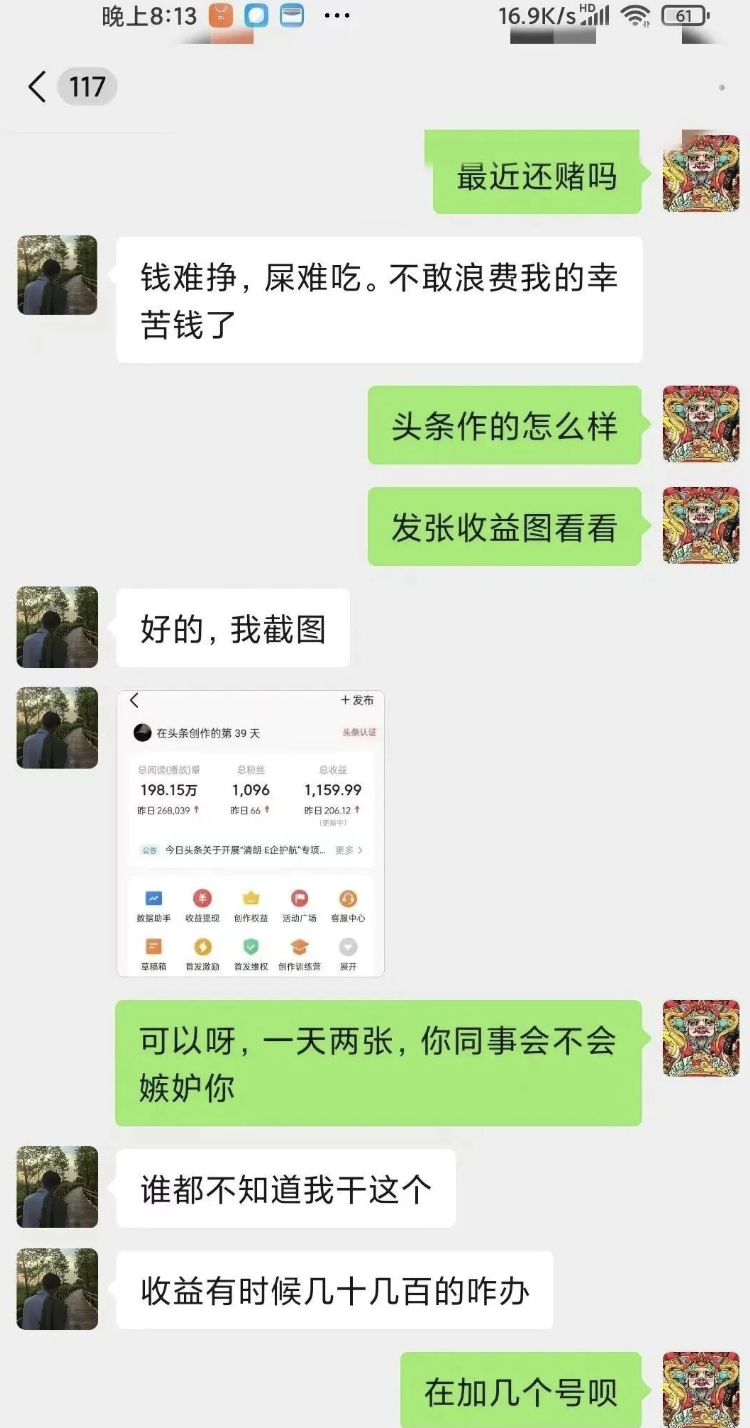 不过我有个22岁做服务员的学员,他之前特别喜欢玩网赌,在外面欠了2万块,不过现在已经金盆洗手,专研今日头条搬运视频。