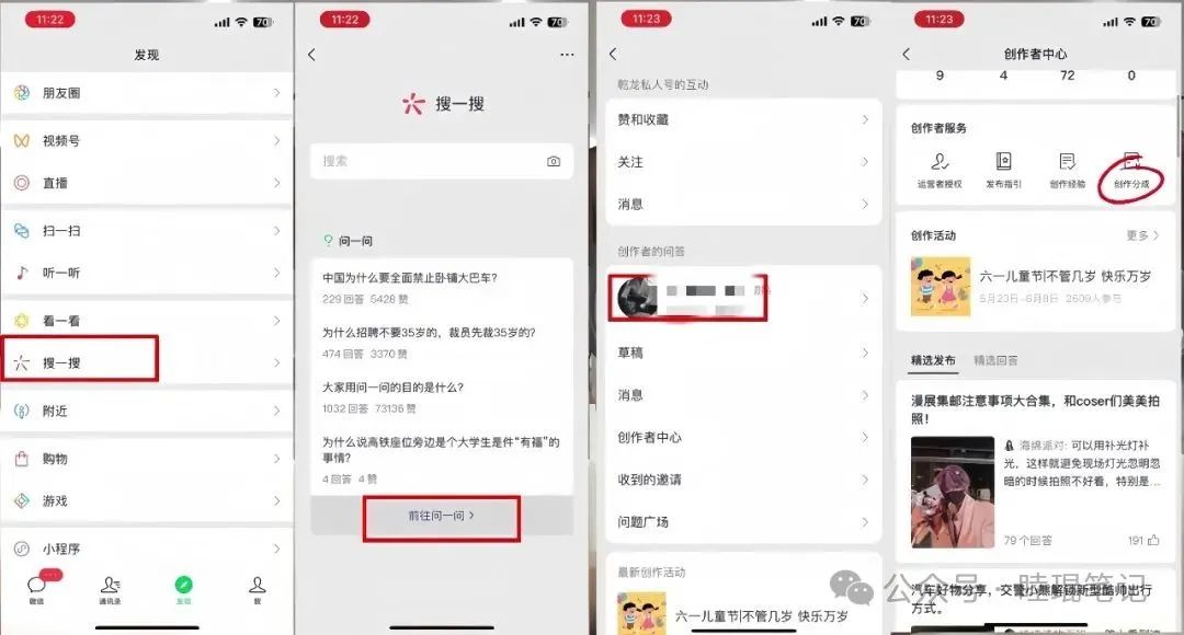 我们打开聊天软件,直接到发现页里拍搜一搜拍拍问一问,进去拍图像,接着拍创作者中心,然后开通创作分成