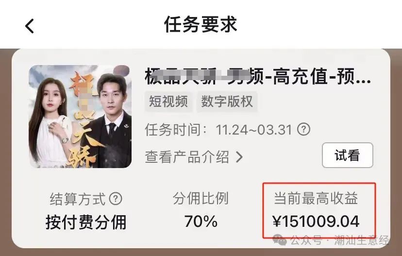 而且这里个平台还能参与「短剧推广」或「小说推文」任务,用户充值后抽佣50%-70%,单条爆款视频收益可达500