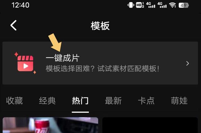 找到模板后,点击相应的模板,界面将自动切换,并在最顶端找到”一键成片”选项,如下图所示: