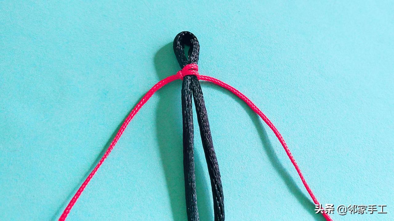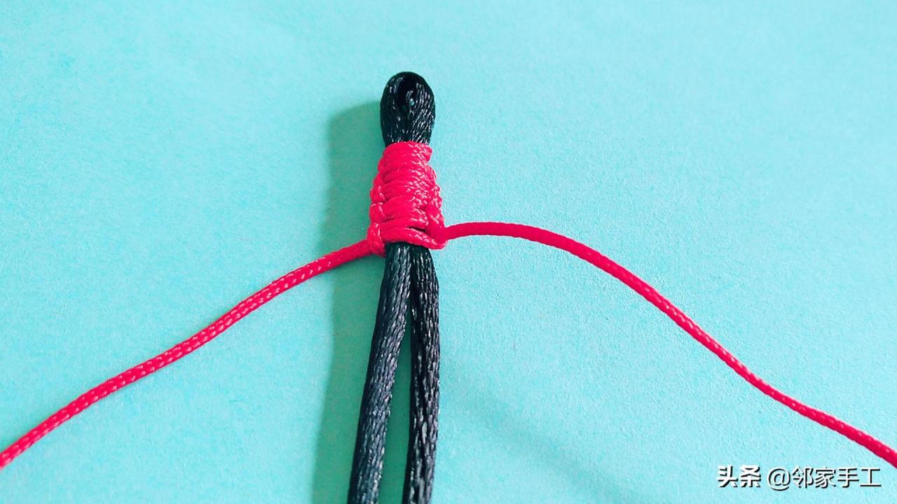 接下来,拿一根72号玉线,颜色为红色,长度为280cm,开始进行第一组平结。
