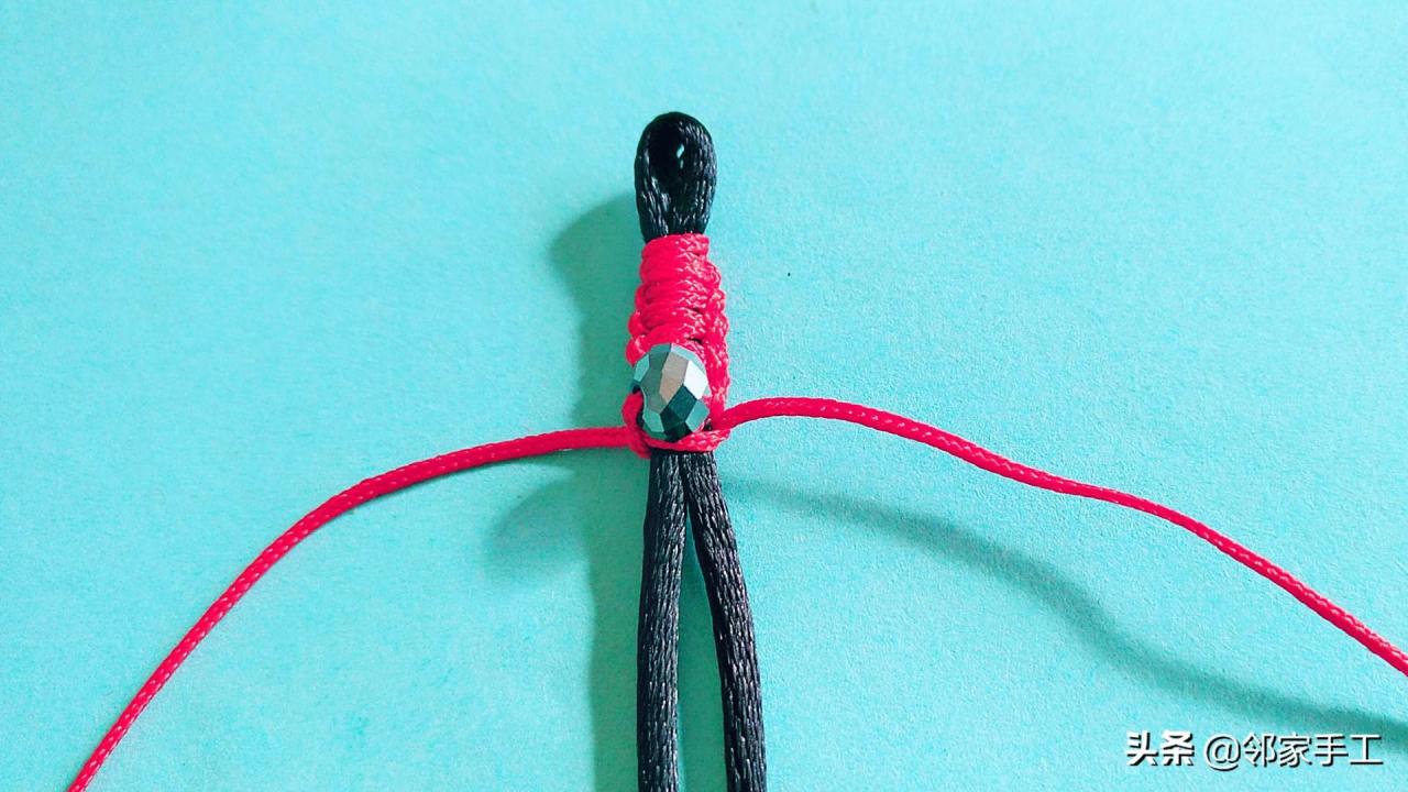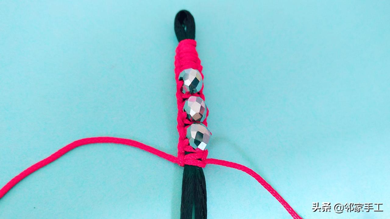 在完成五组平结后,将一颗珠子穿入,然后继续进行正常的平结。