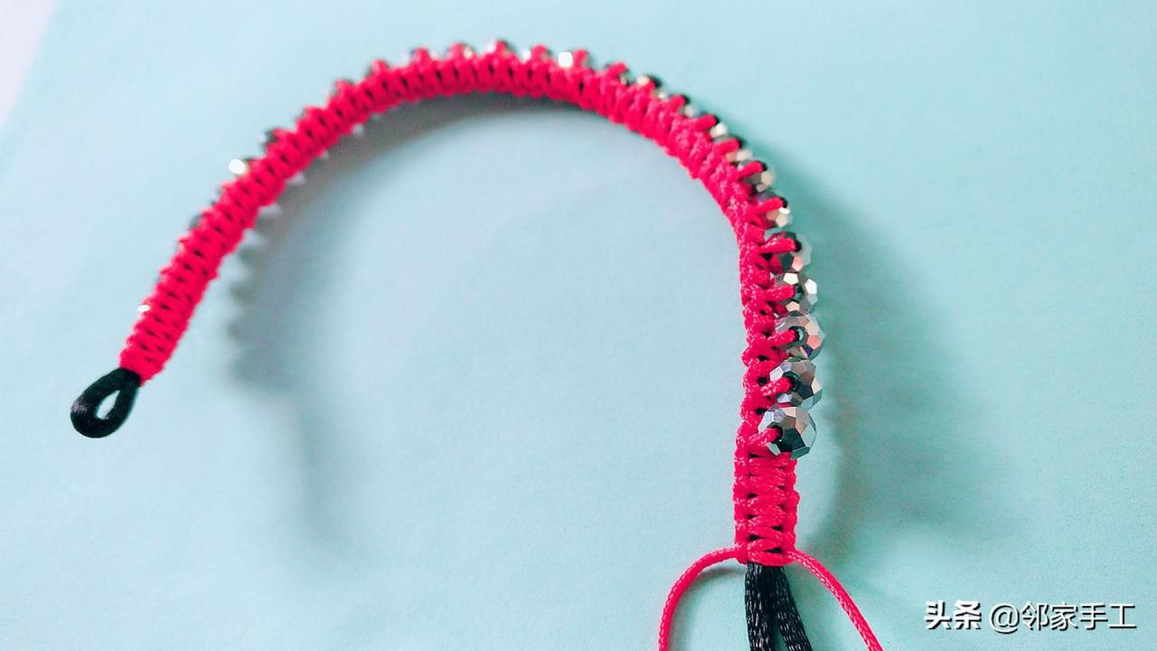 将超出需要长度的线头剪除,然后用黑色线条编织成一个蛇结,使其成为最终的收尾。