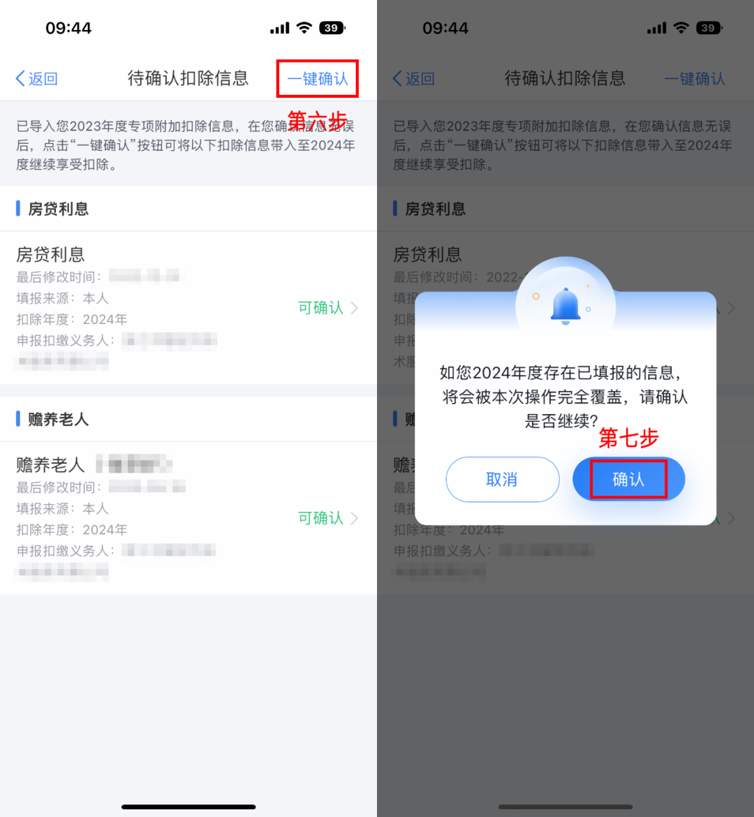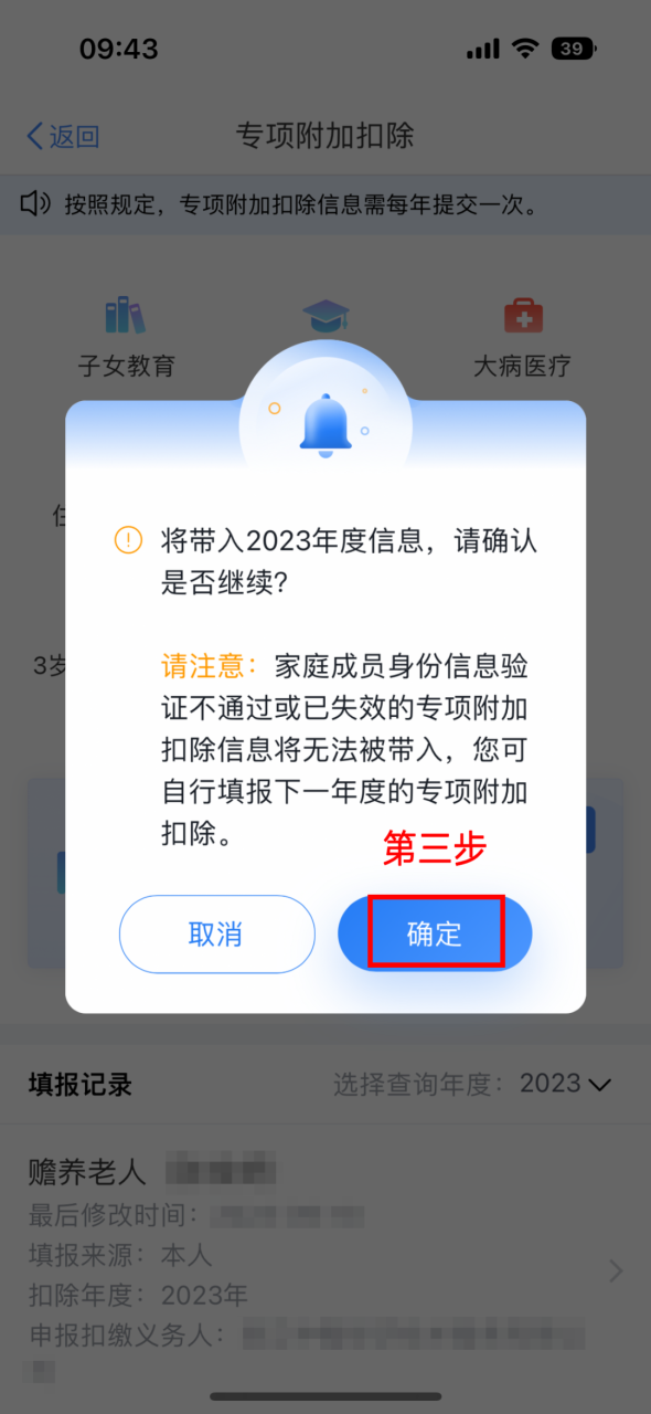 (2) 根据提示“将带入2023年度信息,请确认是否继续?”或者“您在2024年度已存在专项附加扣除信息,如果继续确认,将覆盖已存在的专项附加扣除信息!”,确认无误后,请点击【确认】。如下图所示: