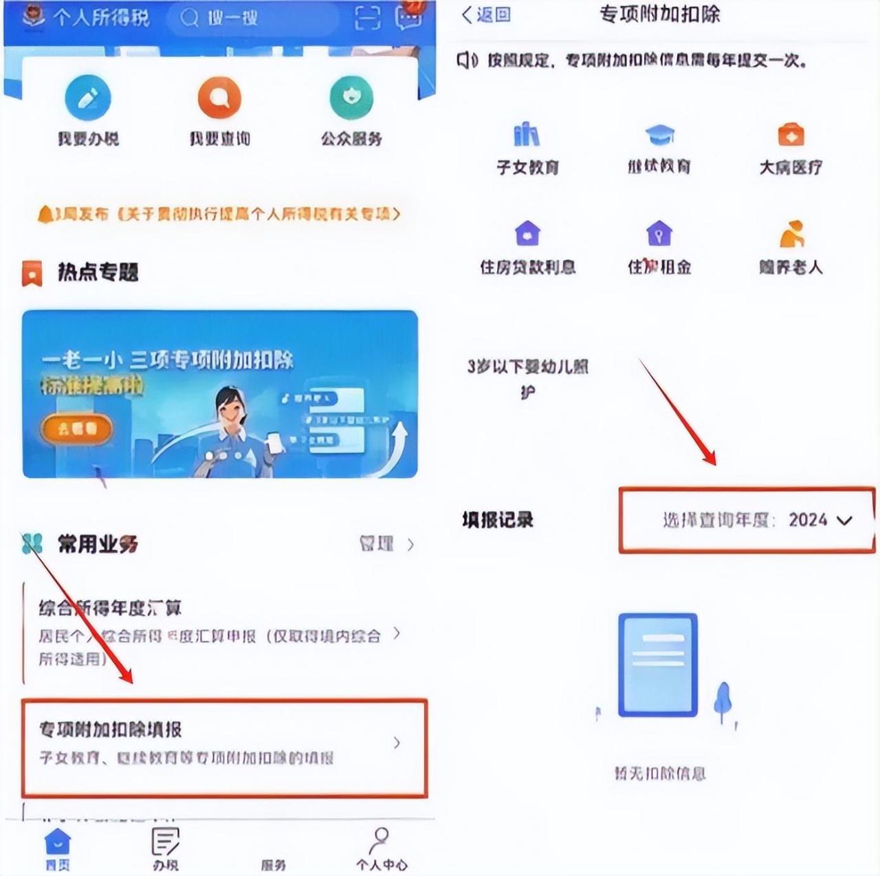 (1)点击【专项附加扣除填报】后,进入填报页面。在填报页面中,选择【查询2024年度】以查看相应记录。