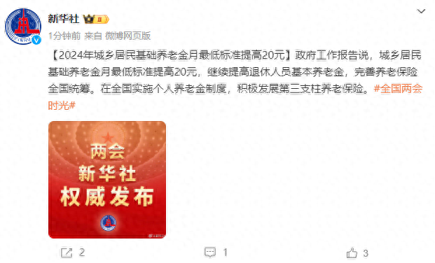 工作报告提出,城乡居民基础养老金月最低标准将增加20元,继续提高退休人员基本养老金,并完善养老保险全国统筹。同时,将在全国范围内推行个人养老金制度,积极推动第三支柱养老保险的发展。