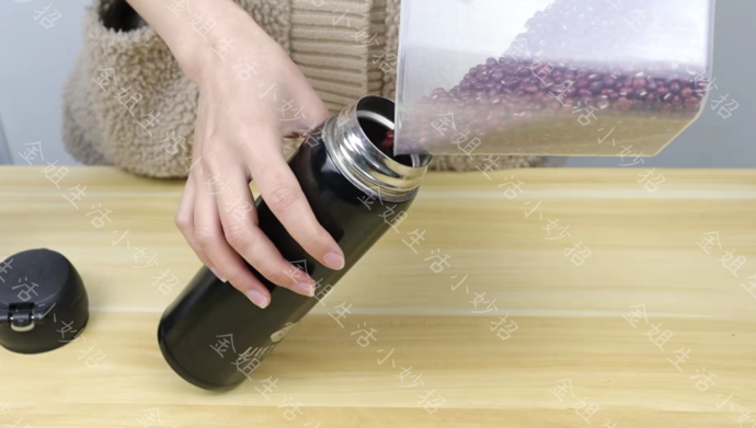 接着,轻轻地将豆类倾倒入保温杯中,其出色的密封性能有助于维持豆类的干燥和新鲜。