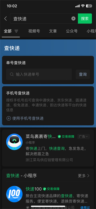3、微信查询:在微信中搜索”查快递”后,在搜索结果中输入快递单号即可进行查询。