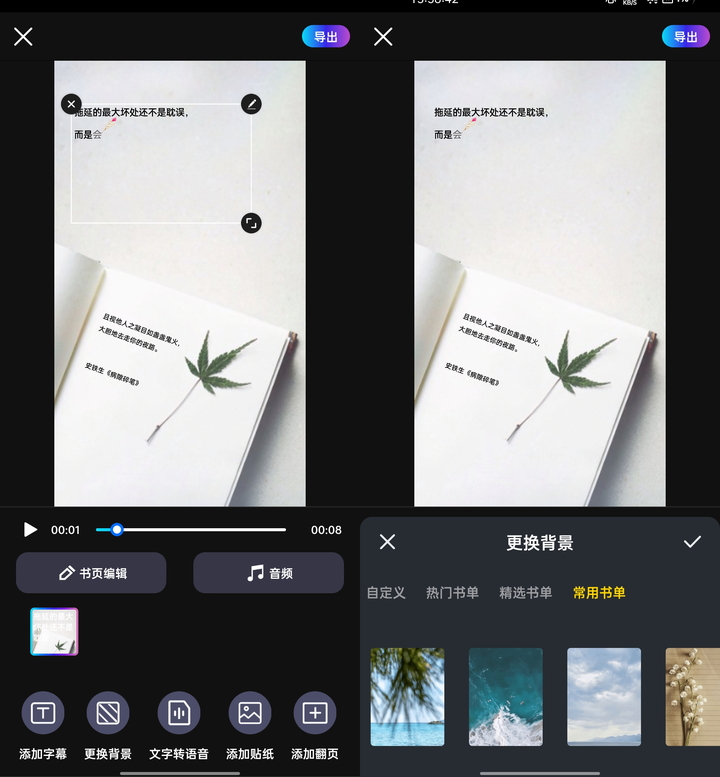 不管是背景、音乐,又或者图片、字幕等,全都可以编辑更改,随心调整字体、颜色和动画效果,就能快速创建内容丰富有吸引力的书单视频。