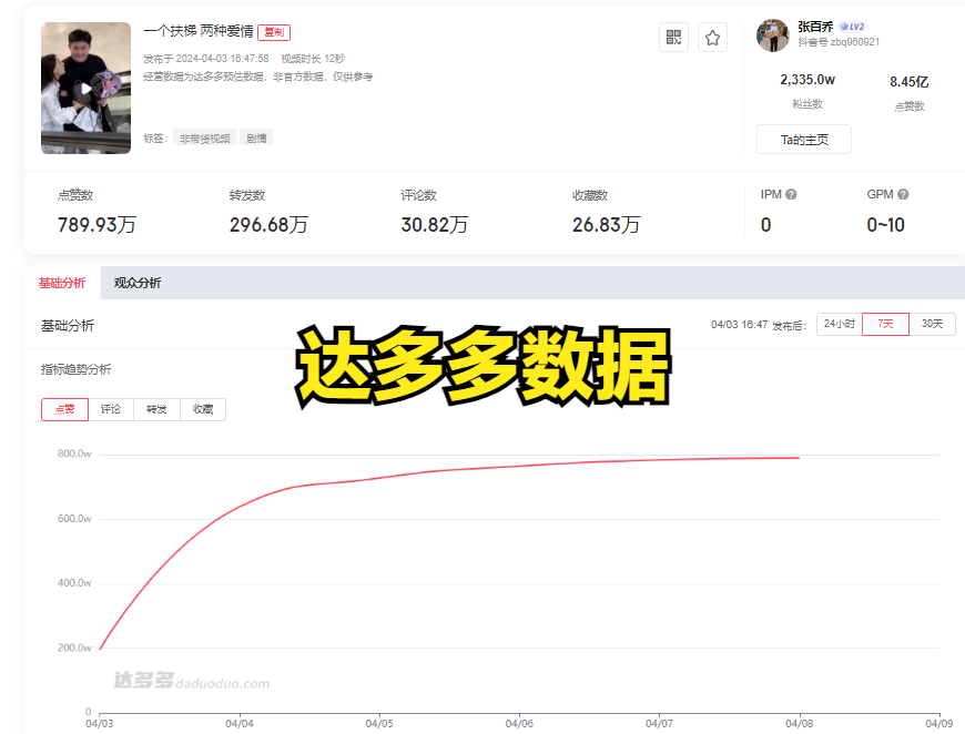 作为一个短视频创作者,我们必须要充分的重视数据的重要性,做好数据分析等工作。我们发的每个视频都要做好数据分析,今天发的视频时长是多少?什么时候发布的?曝光量是多少?阅读量是多少?这些我们都是可以通过专业的数据分析工具去了解的,这样我们在今后的作品分析中,通过数据的变化就可以很快的找到自身的问题: