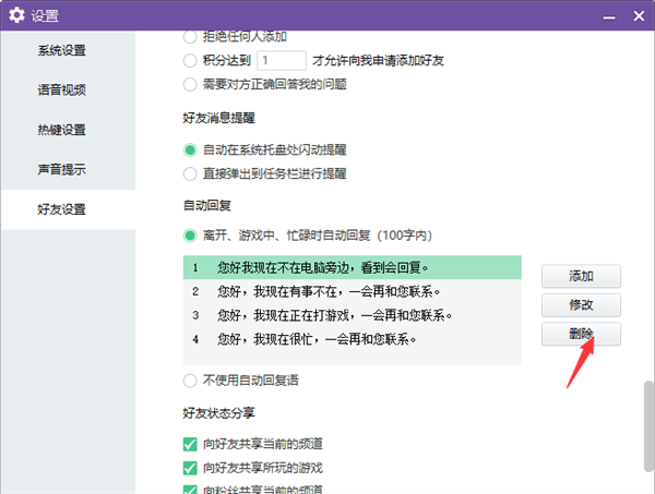7、最后可以把不需要的多余的自动回复点击【删除】即可。