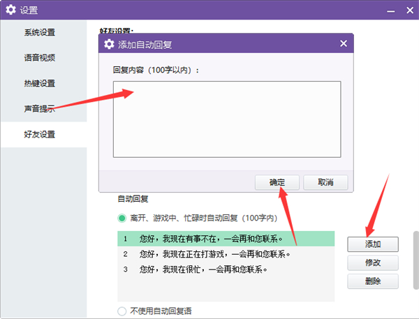 5、点击右侧的【添加】,可以编辑新的一条自动回复,点击确定即可添加到自动回复中。
