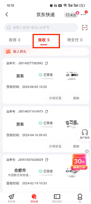 答案:【京东】-【我的】-【京东快递】-【查快递】-【我收】。